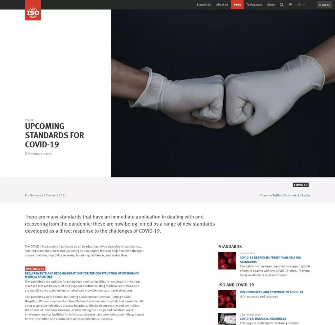 在此新冠肺炎疫情持續蔓延、亟待國際合作共同抗擊疫情之際,IWA 38《應急醫療設施建設導則》作為ISO應對新冠肺炎疫情的系列標準之一先行發布,為世界各國安全、適用、快速建設應急醫療設施提供了有力的技術支持,為中國乃至世界人類健康事業作出了巨大的貢獻。