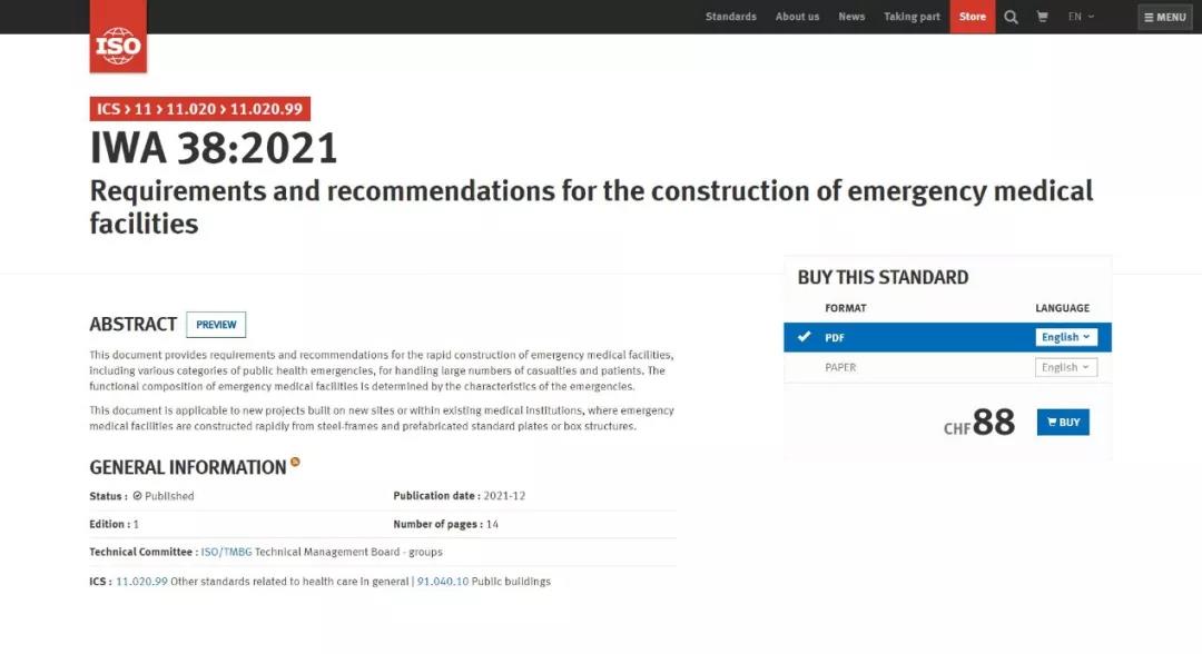 2021年12月20日,國際標準化組織(ISO)官方網站正式發布了中國中元牽頭提出的國際研討會協議IWA 38《應急醫療設施建設導則》(以下簡稱“《導則》”)。